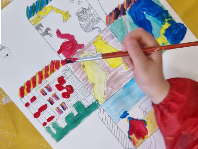 d’abord un moment dédié à la peinture,puis un temps de séchage durant lequel nous pourrons échanger avec l’artiste sur son métier ou lire quelques albums, enfin, l’assemblage de nos cubes pour donner vie à nos créations.